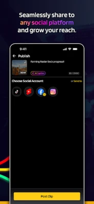 实现持续内容创作,加速您的增长步伐。Eklipse让您轻松像专业人士一样发布作品。只需轻点几下,即可将您完成的视频直接分享到TikTok、Instagram和YouTube Shorts等热门社交平台,省去了繁琐的下载或额外步骤。通过批量编辑并安排一周内的发布计划,有效规划您的内容策略,确保即使您不在线,观众也能持续互动。对于追求极致优势的创作者,Eklipse Premium将解锁优先处理权限,即使在高峰时段也能更快地获取您的精彩集锦。享受高质量、无水印的渲染输出,提升您的品牌形象,抢先体验对新潮游戏的亮点支持,更有更多独家定制工具及专属特权等您探索。
