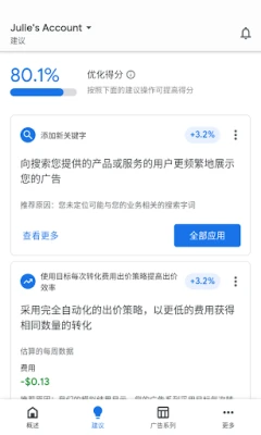 利用 Google Ads,您将拥有对广告系列无与伦比的掌控力。轻松调整出价策略、管理预算分配,并精准优化关键词,以确保您的信息在最合适的时机呈现给最需要的人。应用程序实时呈现的转化次数、展示量和点击率等关键指标,让您对广告效果一目了然。更有智能优化得分指引方向,基于深度的战略分析提供可操作的建议,助您不断提升广告表现,实现业务增长。
